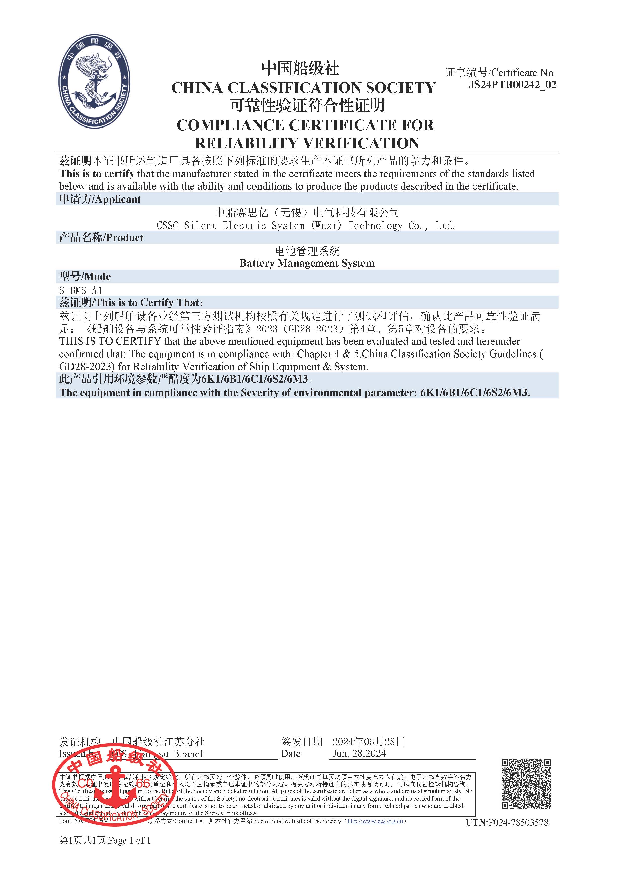 電池管理系統(tǒng)(BMS)型式認(rèn)可證書(CCS)