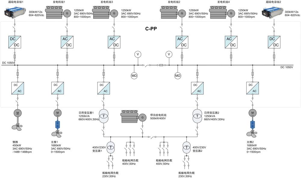 “美維凱悅”游輪總長149.99米,型寬21.8米,型深4.5米,設計吃水2.9米,為鋼質(zhì)、雙尾、前傾首柱、雙槳、雙舵、雙電機驅(qū)動的游輪,可搭載游客690客位,系統(tǒng)配置4臺1250kW的柴油機組,2套300kW的超級電容和2臺1680kW的推進電機。該游輪主要用于接待國內(nèi)外賓客游覽長江三峽,是長江干線重慶至上海移動的五星級水上酒店。